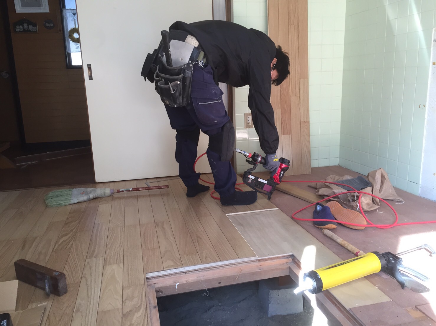 今回のリフォームでは、まず合板を敷いたうえでフローリングを張るという